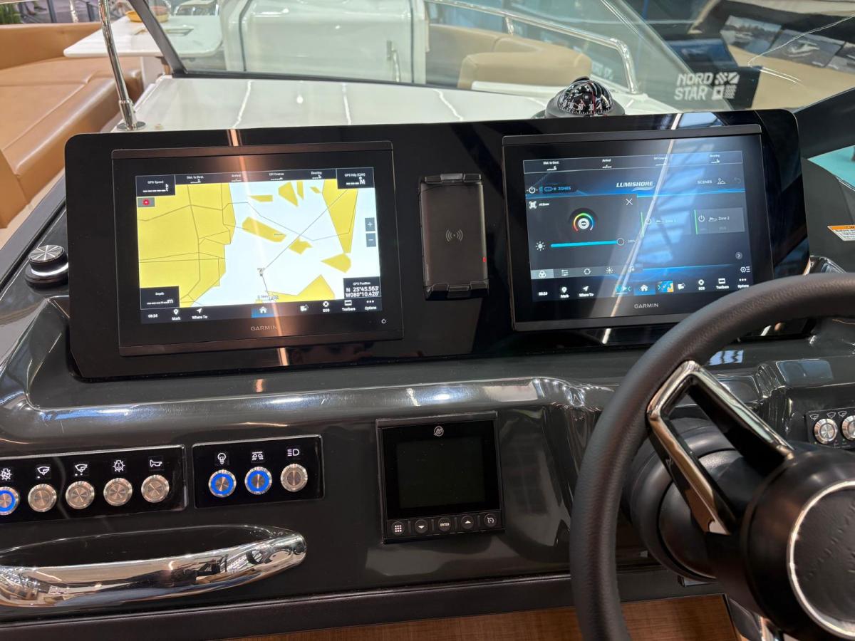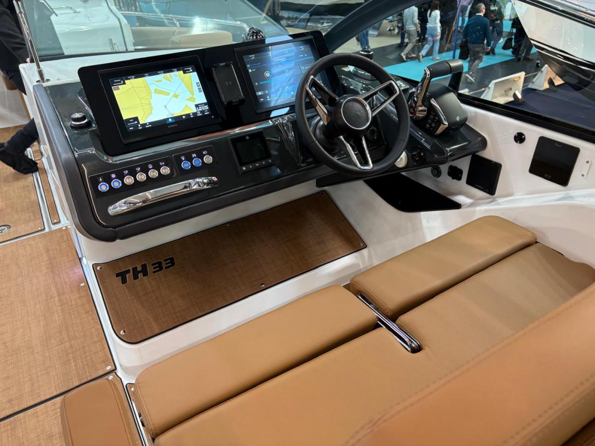 De TH33 biedt ruime buitenruimtes die uitnodigen tot gezelligheid en ontspanning. De ergonomische stuurstand, met brede, comfortabele stoelen aan de voorzijde, zorgt voor een veilige, natuurlijke zitpositie. De technologie aan boord, waaronder twee 12-inch multifunctionele Garmin-schermen en een 7-inch scherm aan de passagierszijde, vergemakkelijkt de bediening en versterkt het vertrouwen. De geïntegreerde voorruit en optionele hardtop bieden effectieve bescherming tegen wind en andere weersinvloeden, zodat u het hele jaar door rustig kunt varen.