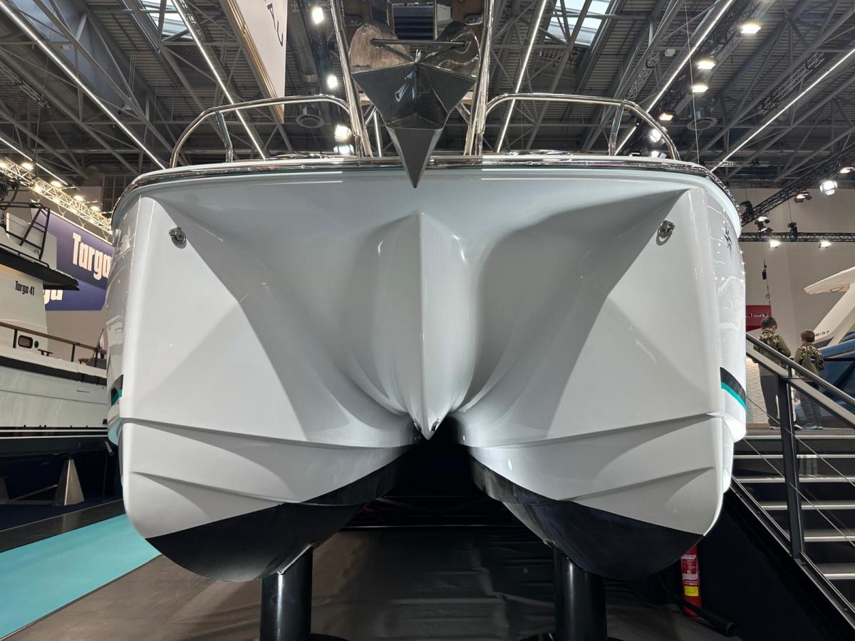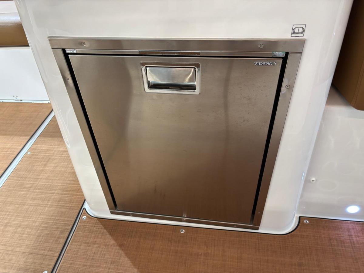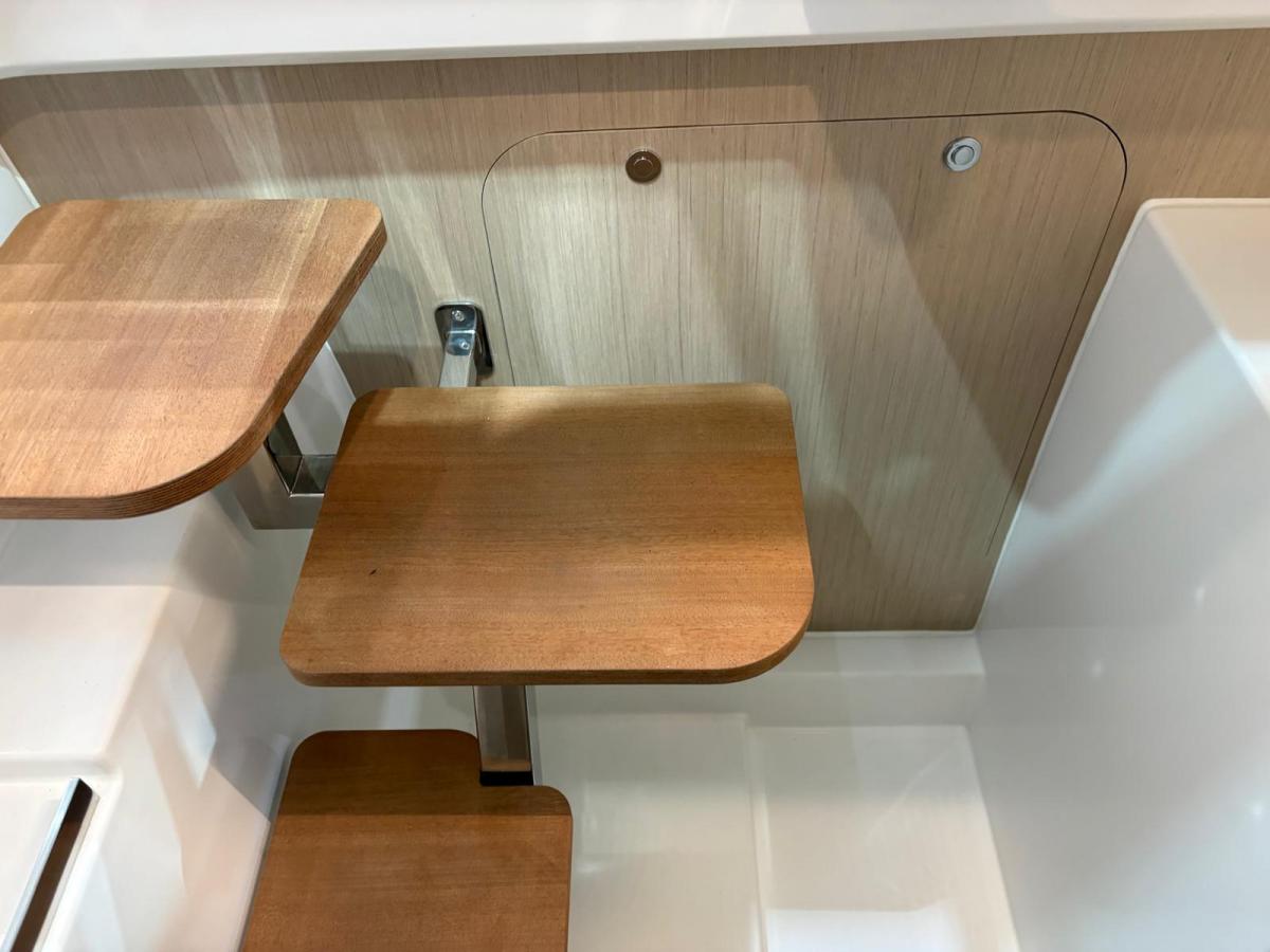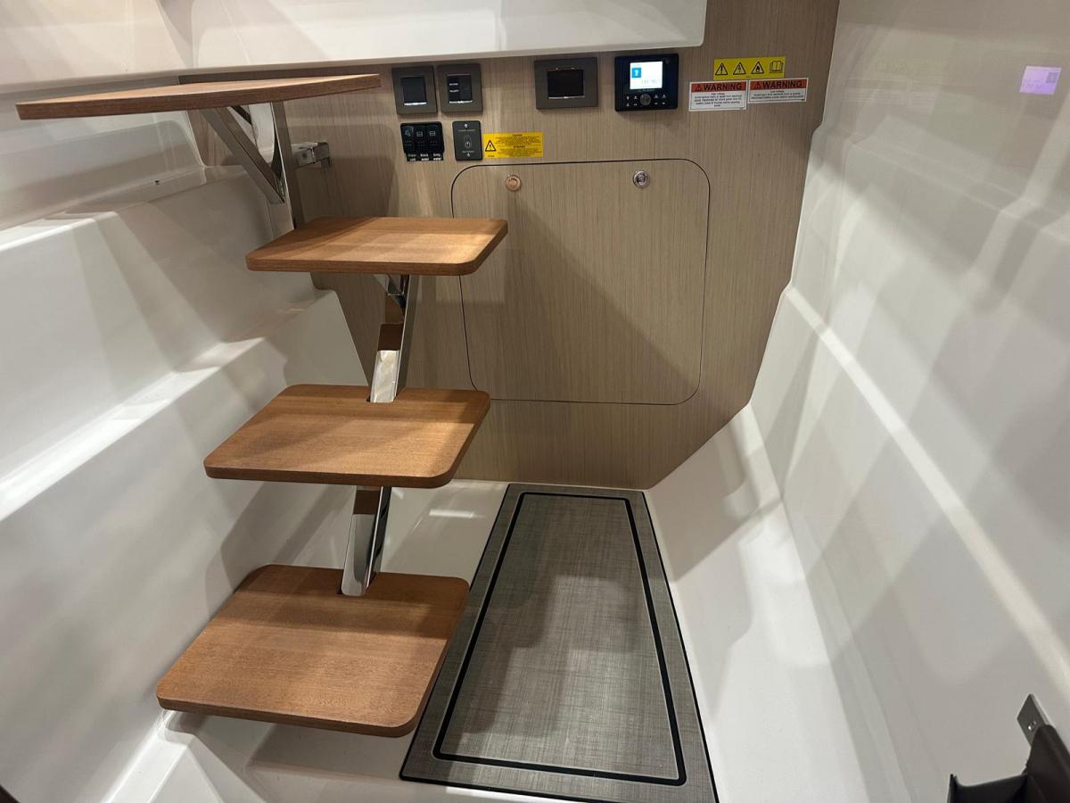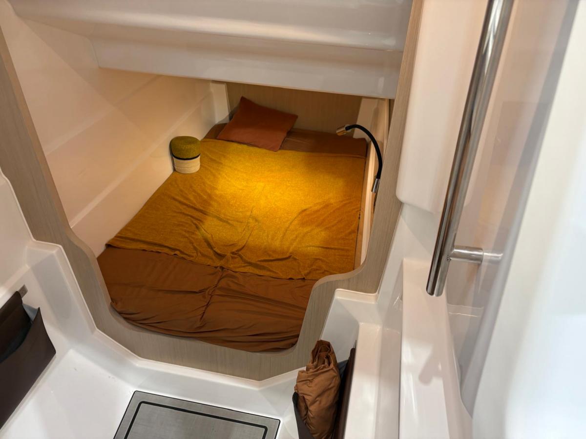 Een ruime opbergruimte biedt plaats aan de uitrusting aan boord, terwijl het optionele Cabin Pack de ruimte omtovert tot een lichte en uitnodigende leefruimte, inclusief: een comfortabel matras, leeslampjes, met leer beklede opbergvakken en natuurlijk licht dat door de ramen in de romp naar binnen valt, waardoor een zachte sfeer ontstaat die bevorderlijk is voor ontspanning, voor elk uitstapje op zee.